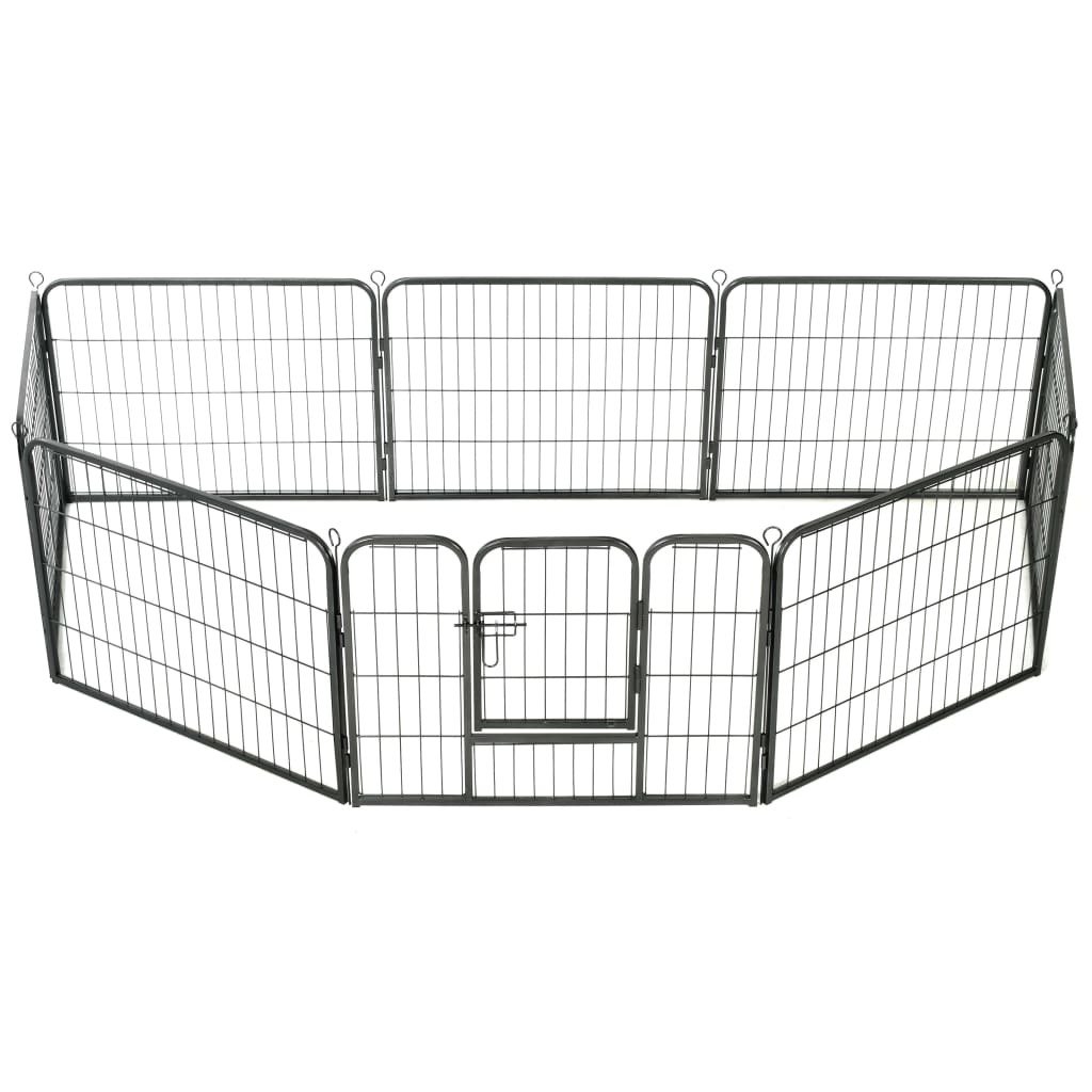 This dog kennel can be easily set up or taken down. It consists of 8 heavy-duty panels and each panel can be easily attached to the next, which allows you to configure the playpen in different shapes. The dog enclosure features a hinged door with a security latch for easy access. This durable and weather-resistant dog playpen is made of rustproof powder-coated steel, making it suitable for outdoor and indoor use. The included ground stakes help secure the playpen outdoors for added stability and security.Color: BlackMaterial: Powder-coated steelEach panel size:31.5" x 23.6"(W x H)Door size:12.2" x 16.9"(W x H)With 8 heavy-duty panelsWith 1 hinged door with a security latchSuitable for indoor and outdoor useEasy to assembleGround stakes included