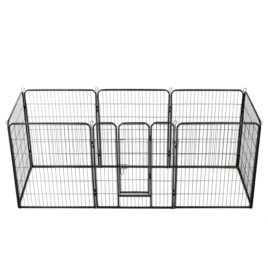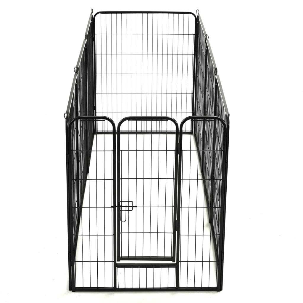 This dog kennel can be easily set up or taken down. It consists of 8 heavy-duty panels and each panel can be easily attached to the next, which allows you to configure the playpen in different shapes. The dog enclosure features a hinged door with security latches for easy access. This durable and weather-resistant dog playpen is made of rustproof powder-coated steel, making it suitable for outdoor and indoor use. The included ground stakes help secure the playpen outdoors for added stability and security.Color: BlackMaterial: Powder-coated steelEach panel size: 31.5" x 39.4" (W x H)Door size:12.2" x 32.7"(W x H)With 8 heavy-duty panelsWith 1 hinged door with security latchesSuitable for indoor and outdoor useEasy to assembleGround stakes included