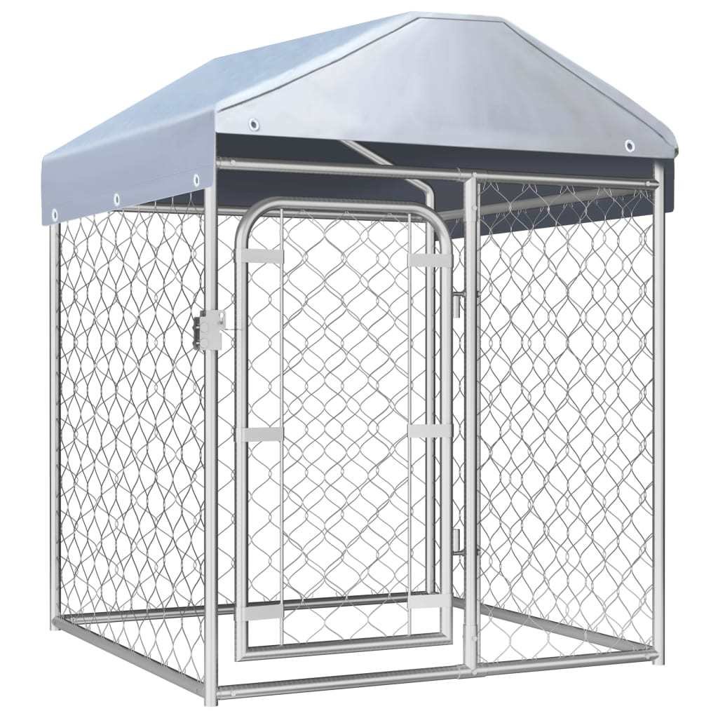 This large dog kennel provides ample exercise space while the chain link mesh all around helps prevent mischief and unexpected accidents while enabling ventilation. Thanks to the sturdy and heavy-duty galvanized steel construction, this quality dog kennel is durable and built to last. Made of 100% polyethylene, the included top canopy is fire-resistant and UV protected, providing protection from sun, rain, snow, as well as other weather conditions. The hinged door with lockable latch system ensures extra security and safety for your dogs. The kennel is easy to assemble.Please note that the door can be installed on the left or right side, which depends on your own needs.Color: SilverMaterial: Galvanized steel frame + fabricOverall dimensions: 39.4" x 39.4" x 39.4"/49.2" (L x W x H)Gate size: 19.7" x 33.5" (W x H)With a roofLockable latch systemChain-link mesh sidewallsSuitable for dogsFabric: Polyethylene: 100%