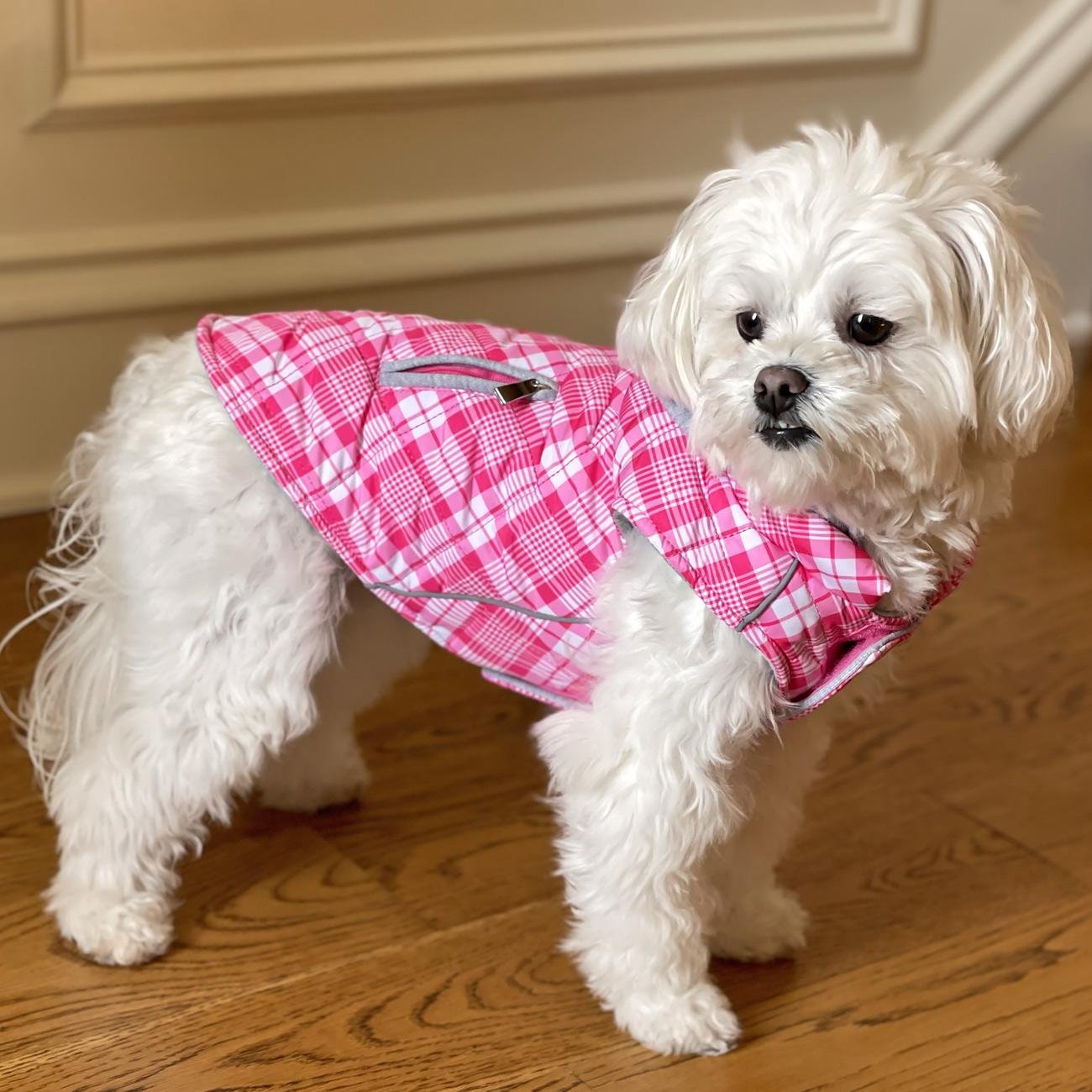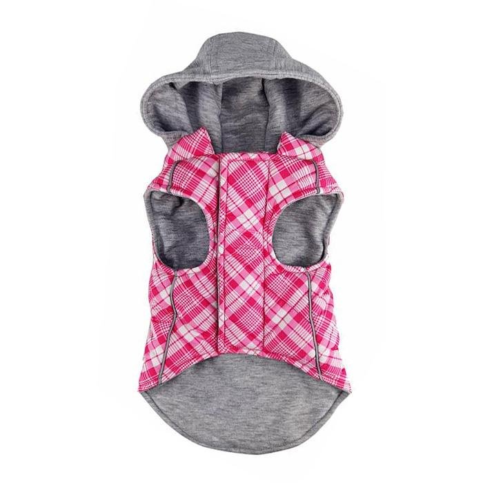 Our quilted Weekender Sweatshirt Hoodies are great for pups on the go! The outer shell is a quilted puffer style while the inner lining is cozy, jersey material. The hood is also made of jersey material and can easily zip off when not needed. Reflective stripping makes your pup noticeable in low light while the two-inch fastener down the chest provides an adjustable closure. Zippered pockets on the back provide a cute finishing detail, as well as an easy place to stash a few treats or a waste bag.