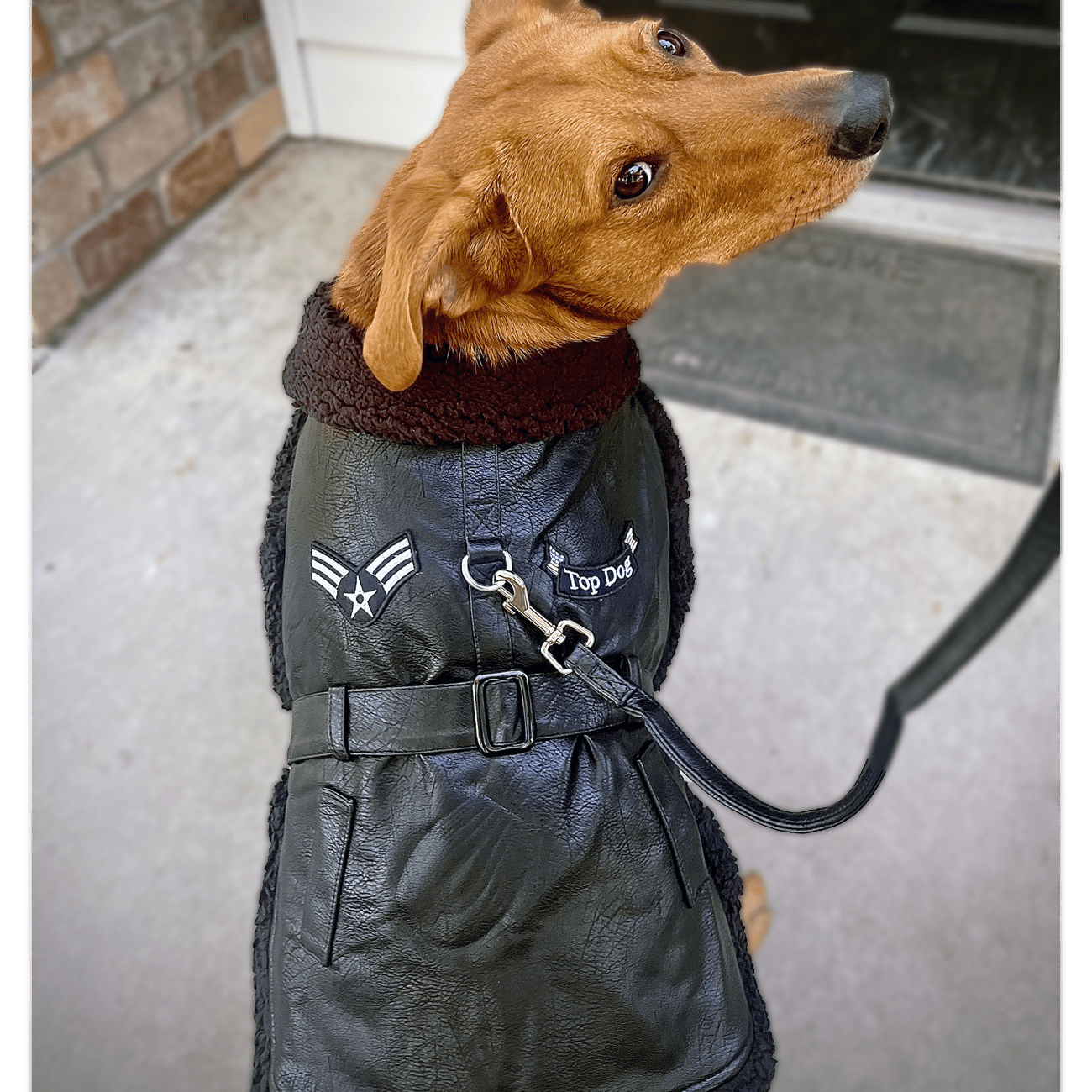 This belted dog coat is crafted in luxury faux leather and faux sherpa trim and includes a matching leash. The inside is lined with a faux sherpa material for an ultra-soft feel. Touch fastener provides adjustable closure at the neck and belt. Custom embroidered patches add an authentic feel to this flight coat.