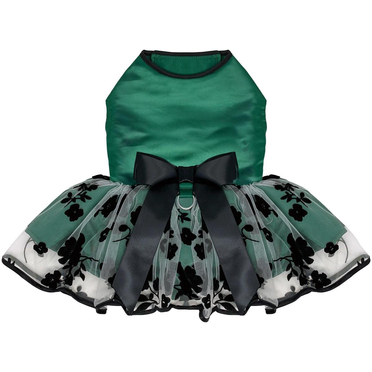 Sophisticated pups wear green. This beautiful green satin dress has a white tulle overlay featuring black velvet flowers. The overlay and neckline of the dress are trimmed in black while a pretty black bow completes the look.